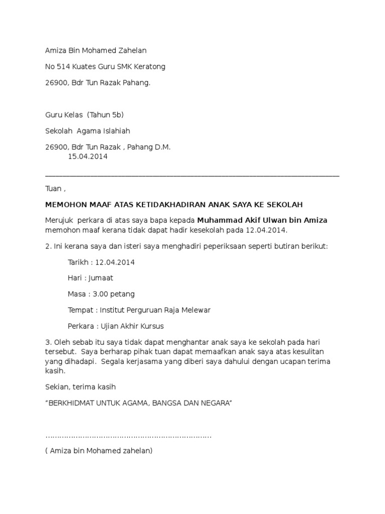 Surat Rasmi Tidak Hadir Sekolah Pdf